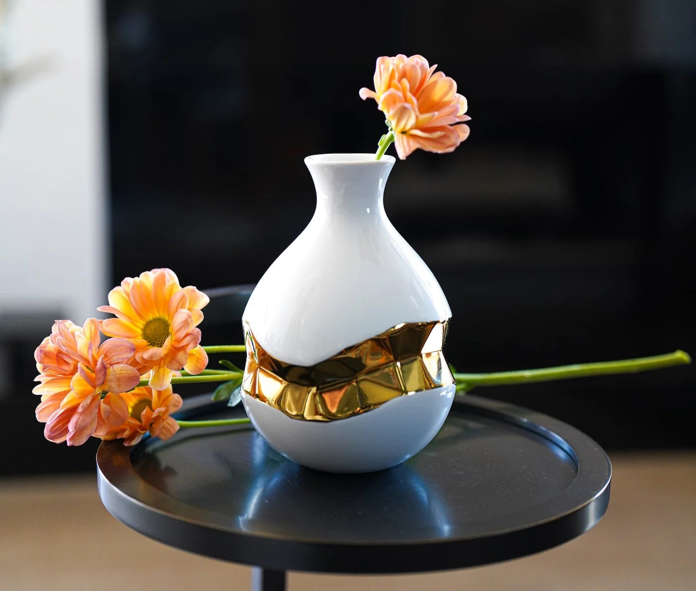 Add height and visual depth to side tables big and small with this gorgeous Talianna Oro Bud Vase. Made with contrasting sleek white and elegant 24K gold, this vase turns any end table into a display of fine art.